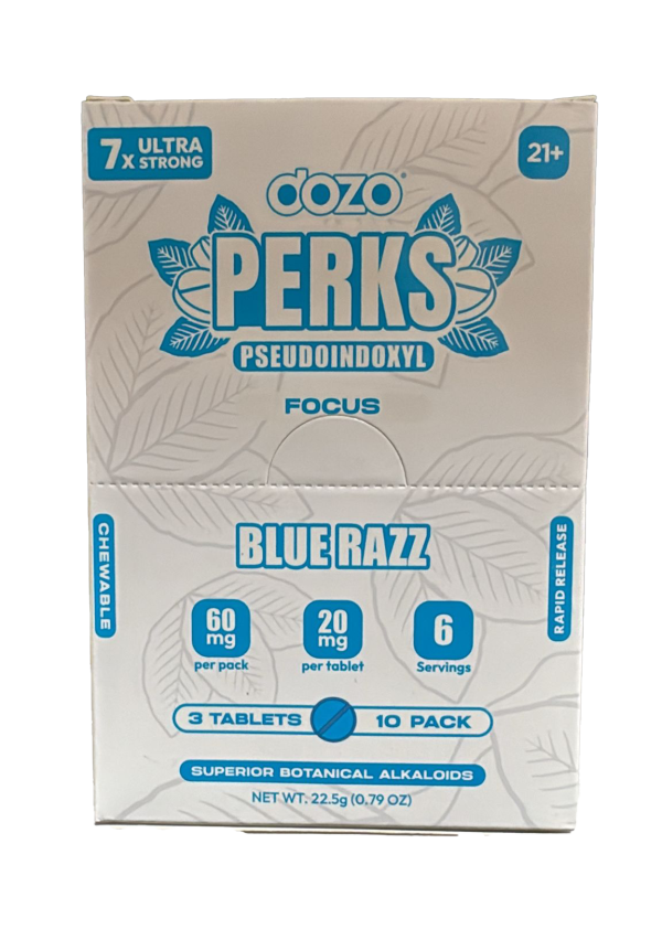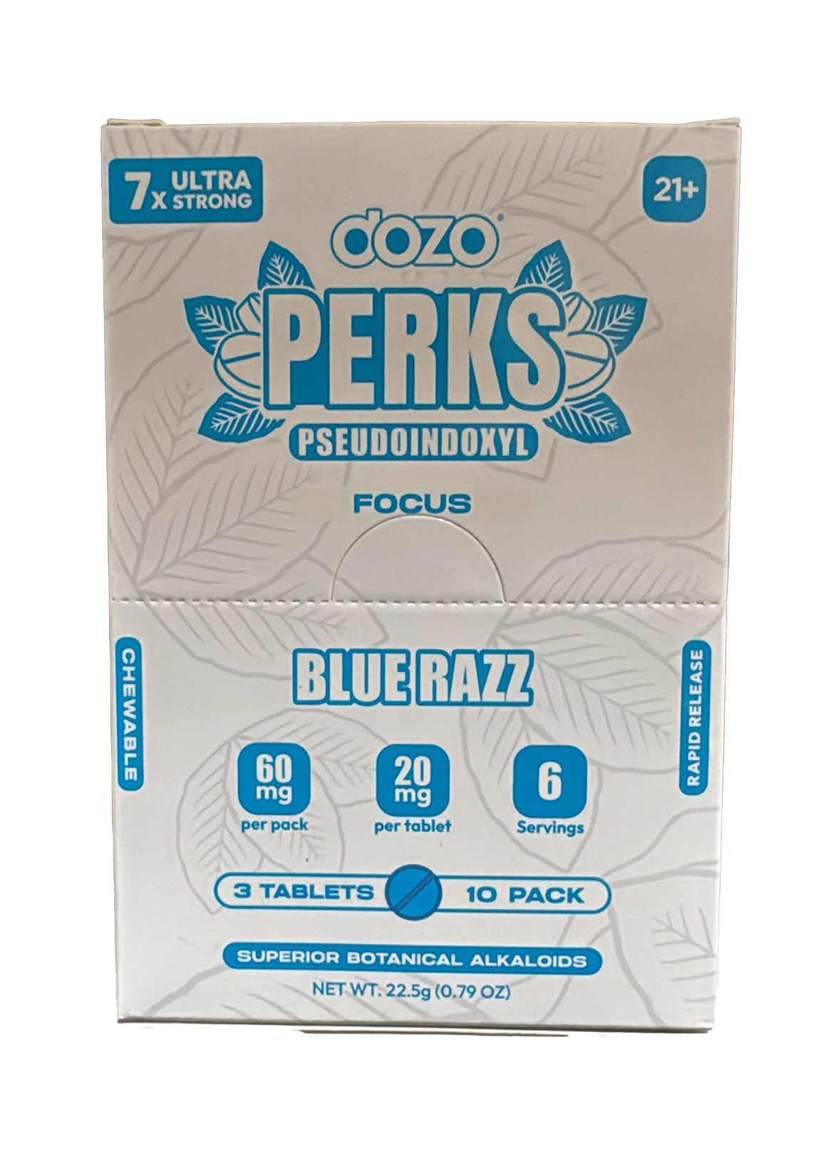 Dozo Perks offers a refreshingly tart **Blue Razz** twist to its precisely formulated **7-Hydroxy tablets**. Each tablet contains **20mg** of active compound,